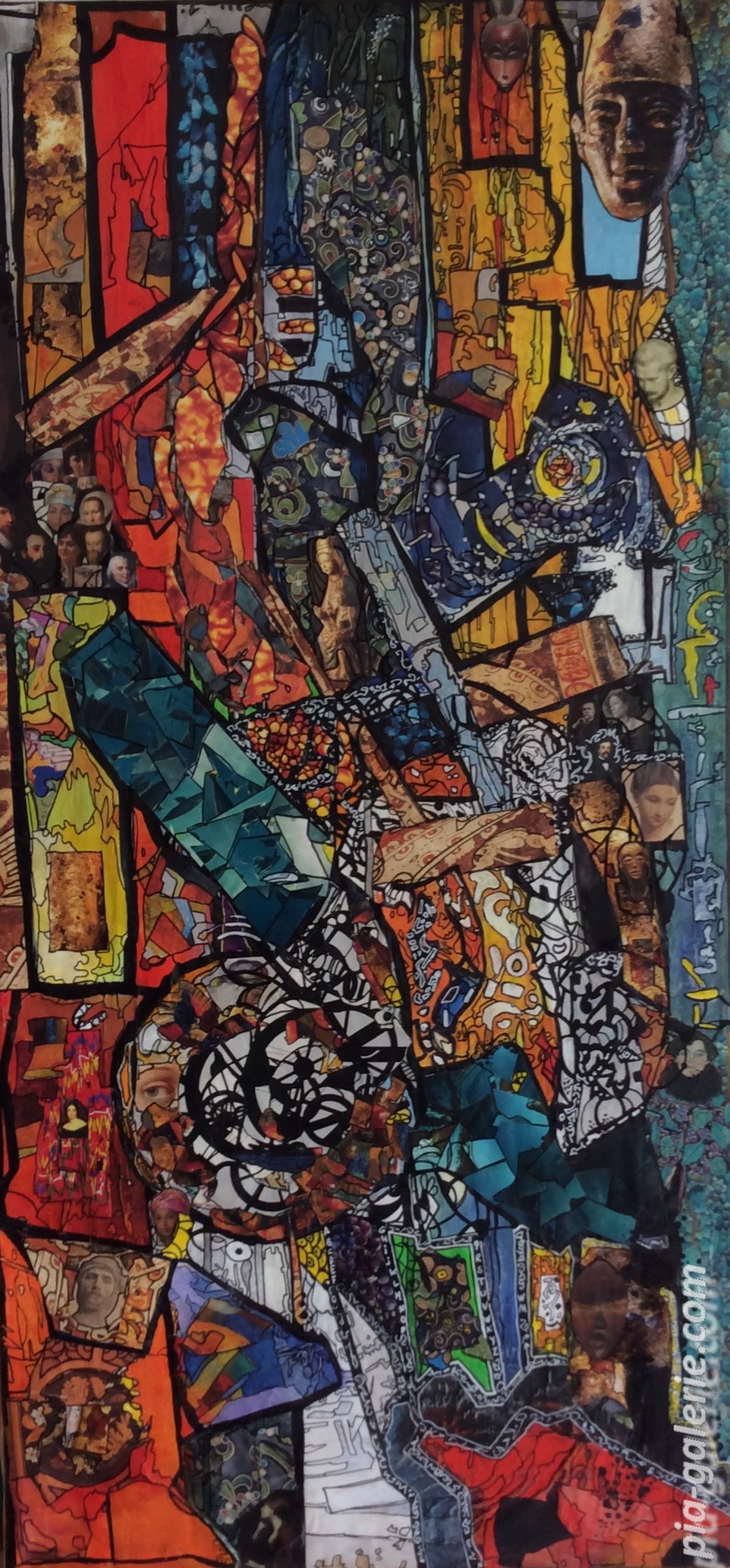 "Le 16ème "Ça" inaugure la « sous-série » des vitraux. Le format vertical, l’assemblage des collages combinés à l’acrylique ont créé une composition qui m’a apaisé, m’a rappelé la sérénité d’un lieu de culte."