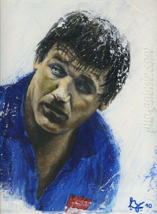 "« Papa » appartient au tryptique « multiple de 3 » qui présente les portraits des rugbymen Jacques Fouroux (n°9), robert Paparemborde (n°3) et Jean-Pierre Rives (n°6). Celui à qui j’ai offert ces tableaux avait côtoyé ces hommes dans les années 70. Il m’avait dit un jour « Pia, si tu veux me faire plaisir, tu peins leurs portraits ». Je les lui ai offerts comme cadeau de Noël, et il y a eu de l’émotion. Il s’agit donc d’un hommage à l’amitié pour chacun de ces trois guerriers de l’ovalie, dont deux sont partis trop tôt, mais aussi et surtout, un acte d’amour."